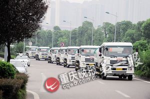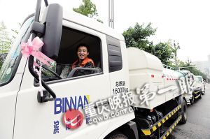 這次婚車創(chuàng)意,并不出自新人和婚慶公司,而是來自新娘的公司。這家民營(yíng)企業(yè)承包了南濱路的道路保潔,這12輛灑水車是公司去年剛購置的,發(fā)喜糖時(shí),公司老總突發(fā)奇想,要用公司的灑水車緊跟婚車隊(duì)伍,表示祝福。